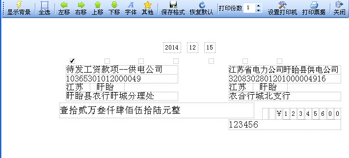 上图展示了一项扬帆票据打印专家独有的功能,通过菜单栏功能键我们可以在打印预览中自由编辑每一个打印项的位置,设置任意打印项不打印等等,简单实用,方便快捷,真正实现与票据的完美套打。