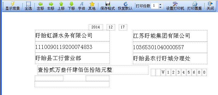 上图展示了一项扬帆票据打印专家独有的功能,通过菜单栏功能键我们可以在打印预览中自由编辑每一个打印项的位置,设置任意打印项不打印等等,简单实用,方便快捷,真正实现与票据的完美套打。
