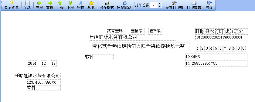 上图展示了一项扬帆票据打印专家独有的功能,通过菜单栏功能键我们可以在打印预览中自由编辑每一个打印项的位置,设置任意打印项不打印等等,简单实用,方便快捷,真正实现与票据的完美套打。
