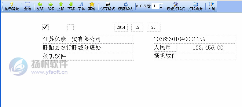 上图展示了一项扬帆票据打印专家独有的功能,通过菜单栏功能键我们可以在打印预览中自由编辑每一个打印项的位置,设置任意打印项不打印等等,简单实用,方便快捷,真正实现与票据的完美套打。