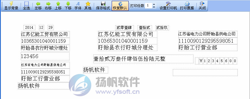 上图展示了一项扬帆票据打印专家独有的功能,通过菜单栏功能键我们可以在打印预览中自由编辑每一个打印项的位置,设置任意打印项不打印等等,简单实用,方便快捷,真正实现与票据的完美套打。