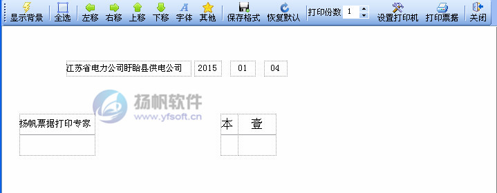 上图展示了一项扬帆票据打印专家独有的功能,通过菜单栏功能键我们可以在打印预览中自由编辑每一个打印项的位置,设置任意打印项不打印等等,简单实用,方便快捷,真正实现与票据的完美套打。