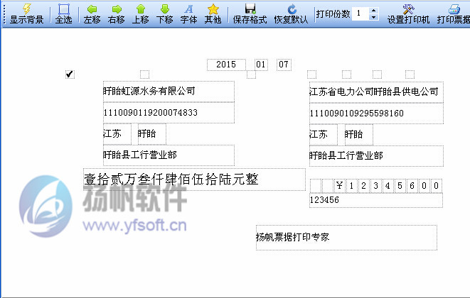 上图展示了一项扬帆票据打印专家独有的功能,通过菜单栏功能键我们可以在打印预览中自由编辑每一个打印项的位置,设置任意打印项不打印等等,简单实用,方便快捷,真正实现与票据的完美套打。