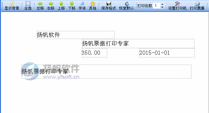 上图展示了一项扬帆票据打印专家独有的功能,通过菜单栏功能键我们可以在打印预览中自由编辑每一个打印项的位置,设置任意打印项不打印等等,简单实用,方便快捷,真正实现与票据的完美套打。
