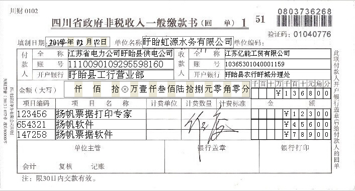 这次给大家展示一张四川省政府非税收入一般缴款书,下面有下载链接大家可以自行下载,如果还没有安装软件,请先下载扬帆票据打印专家2014。选择杨帆票据打印专家,轻松解决票据打印所有难题,操作简单,使用方便,是您票据打印的首选助手。