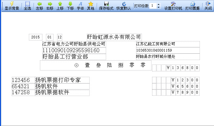 上图展示了一项扬帆票据打印专家独有的功能,通过菜单栏功能键我们可以在打印预览中自由编辑每一个打印项的位置,设置任意打印项不打印等等,简单实用,方便快捷,真正实现与票据的完美套打。