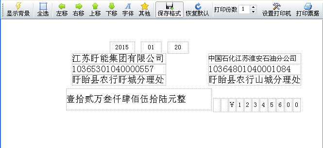 上图展示了一项扬帆票据打印专家独有的功能,通过菜单栏功能键我们可以在打印预览中自由编辑每一个打印项的位置,设置任意打印项不打印等等,简单实用,方便快捷,真正实现与票据的完美套打。