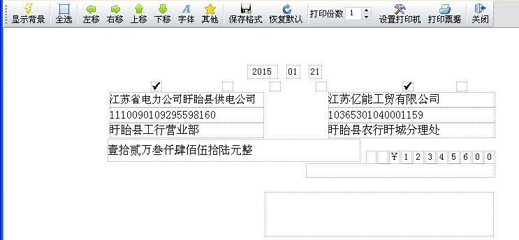 上图展示了一项扬帆票据打印专家独有的功能,通过菜单栏功能键我们可以在打印预览中自由编辑每一个打印项的位置,设置任意打印项不打印等等,简单实用,方便快捷,真正实现与票据的完美套打。