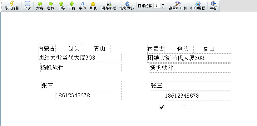 上图展示了一项扬帆票据打印专家独有的功能,通过菜单栏功能键我们可以在打印预览中自由编辑每一个打印项的位置,设置任意打印项不打印等等,简单实用,方便快捷,真正实现与票据的完美套打。