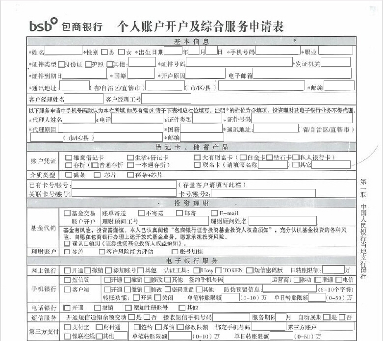 包商银行个人账户开户及综合服务申请表