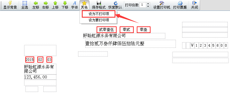 我们在软件中填写好支票后,点击打印,会看到打印预览界面,在这里有一个其他按钮,点击这个按钮,会出现两个选项,其中有一项为设为不打印项,是处理票据上不需要打印的打印项的。