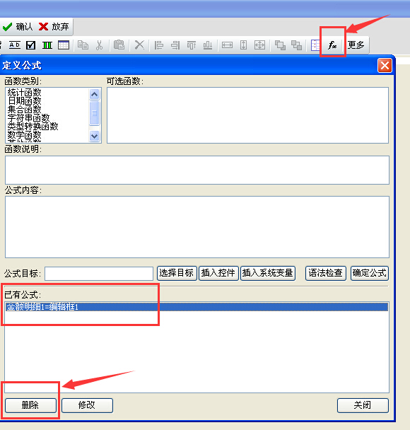 打开模板后,点击设计模板,然后点击函数按钮,选中公式删除即可。