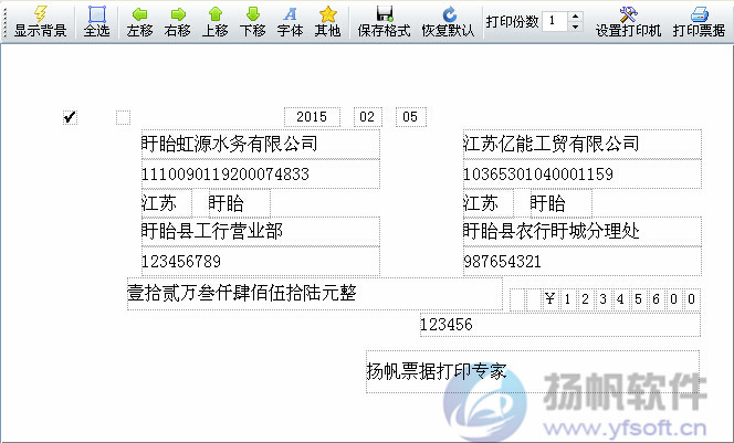 上图展示了一项扬帆票据打印专家独有的功能,通过菜单栏功能键我们可以在打印预览中自由编辑每一个打印项的位置,设置任意打印项不打印等等,简单实用,方便快捷,真正实现与票据的完美套打。