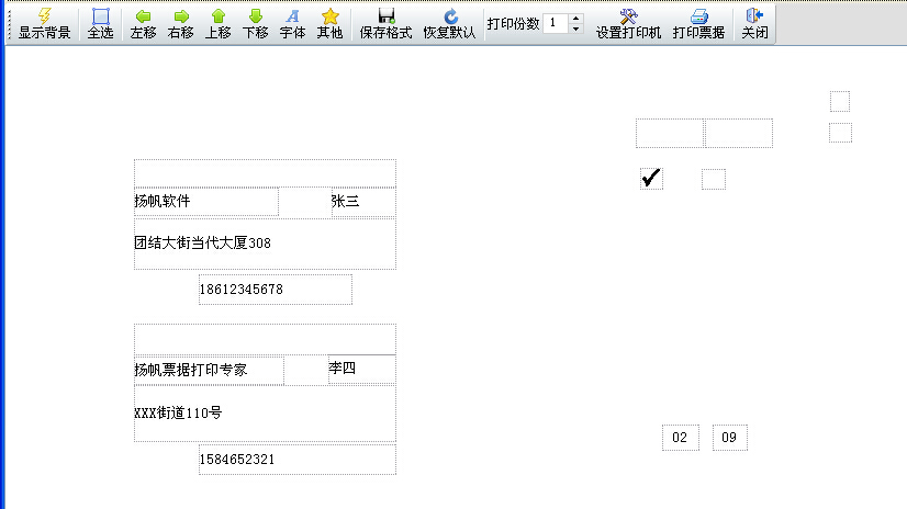 上图展示了一项扬帆票据打印专家独有的功能,通过菜单栏功能键我们可以在打印预览中自由编辑每一个打印项的位置,设置任意打印项不打印等等,简单实用,方便快捷,真正实现与票据的完美套打。