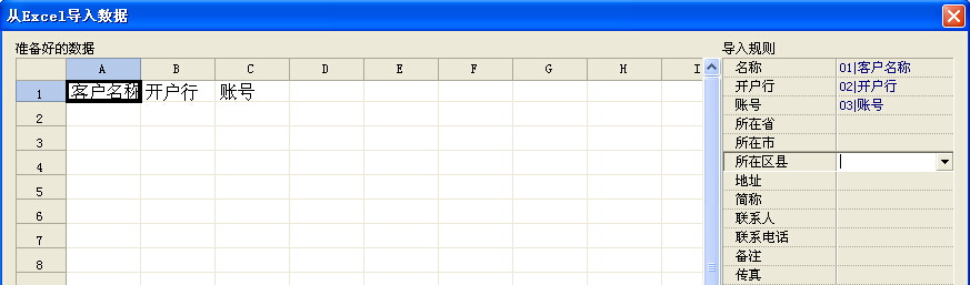 我们向软件中的往来单位列表导入数据,数据是客户名单Excel表格,一共三列,客户名称,账号,开户行。那么我们对应的导入规则自然也是这三个。如图: