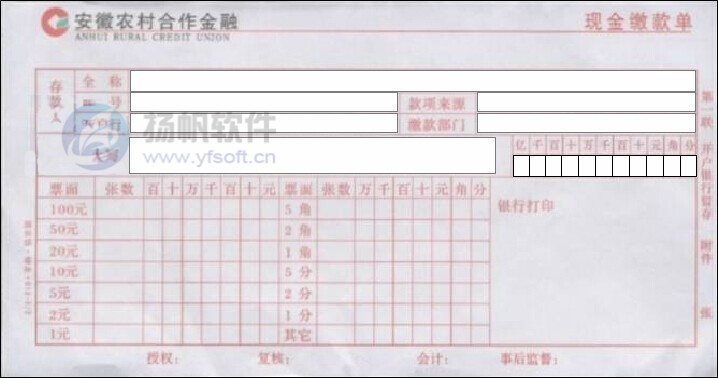 这次发布的是一张安徽农村合作金融现金缴款单打印模板,模板在设计的时候采用关联数据的功能,并且存根上的内容会自动生成,填写简单,打印方便。打印票据,首选扬帆票据打印专家,百家银行票据应有尽有,即使是刚出的新票据,也可以联系我们的客服人员制作模板。