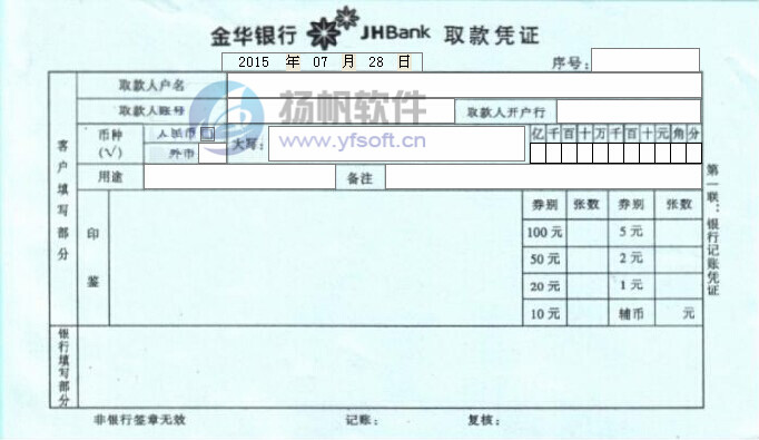 这次给大家展示一张金华银行取款凭证,由扬帆票据打印专家制作。